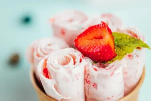 Kem cuộn (hay còn gọi là “rolled ice cream”) bắt nguồn từ Thái Lan và nhanh chóng lan rộng ra khắp châu Á rồi đến các nước phương Tây. Đặc điểm của kem cuộn là được làm trực tiếp trên một chiếc chảo lạnh có nhiệt độ âm sâu. Hỗn hợp kem lỏng được đổ lên mặt chảo, trộn đều với trái cây hoặc topping yêu thích, sau đó được trải mỏng và cuộn lại thành từng cuộn nhỏ xinh.